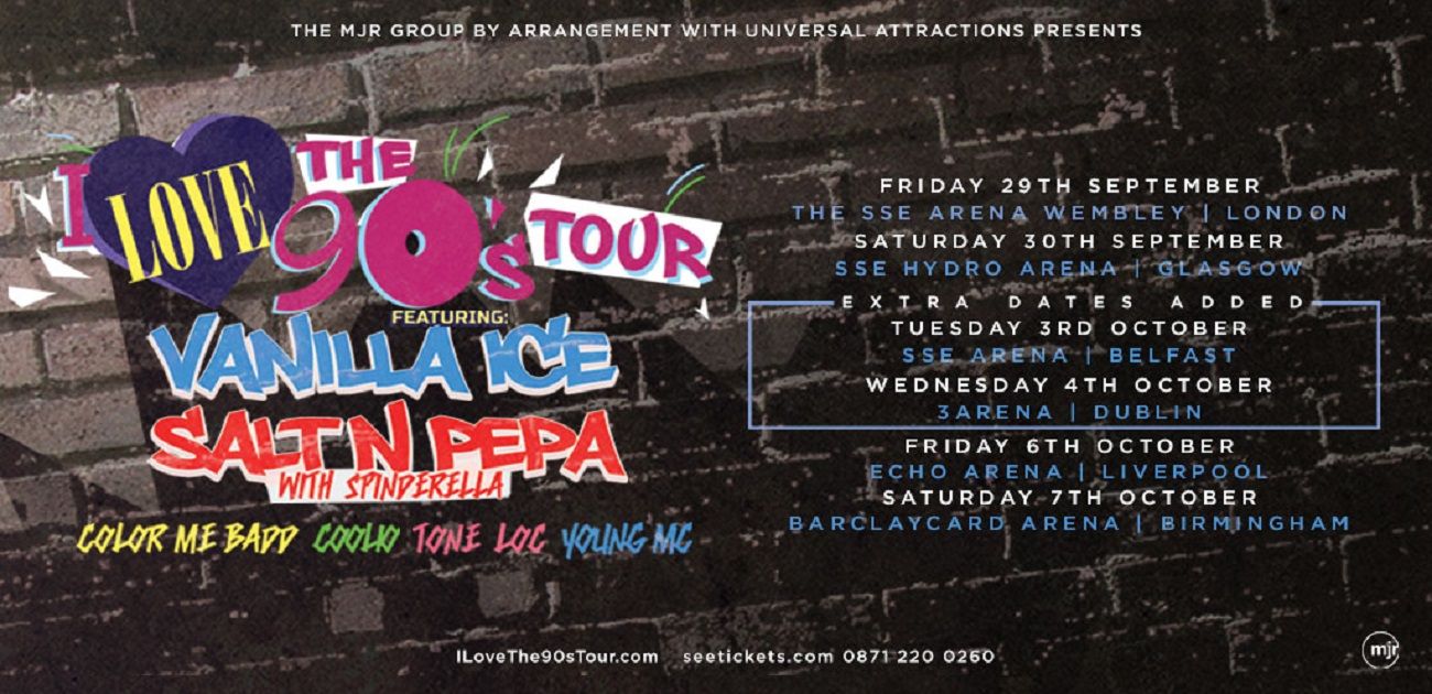 Featuring Vanilla Ice, Salt n Pepa (with Spindarella), Coolio, Colour Me Badd, Tone Loc and Young MC, they will be singing classics such as Push It, Gangstas Paradise, Ice Ice Baby, Funky Cold Medina and Bust a Move!