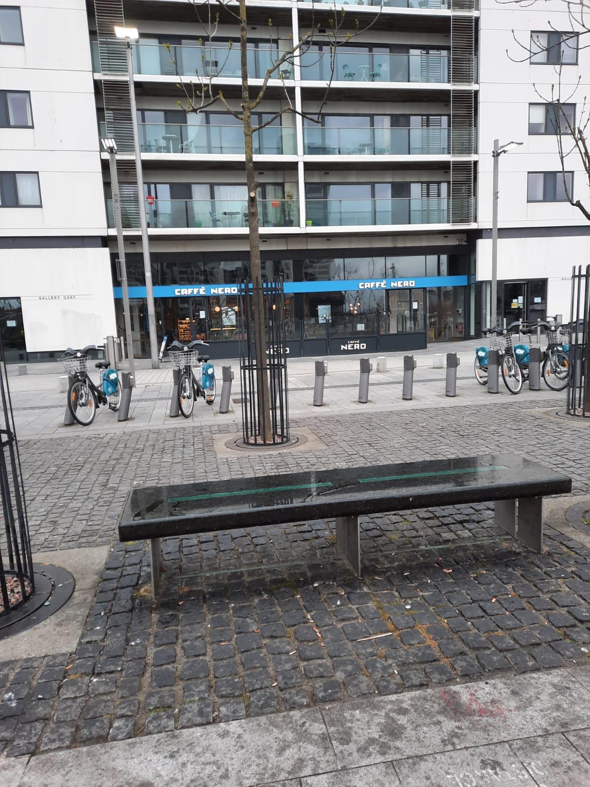 Oil has been placed on the marble seats facing the Dock on the strip from Il Valentino / Gallery Quay / Café Nero. We would ask that no one interferes with estate property. It is also staining the ground.