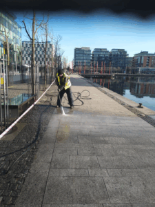 Apleona HSG janitorial team are carrying out their scheduled power washing duties in the Grand Canal Harbour today April 13th, 2021.